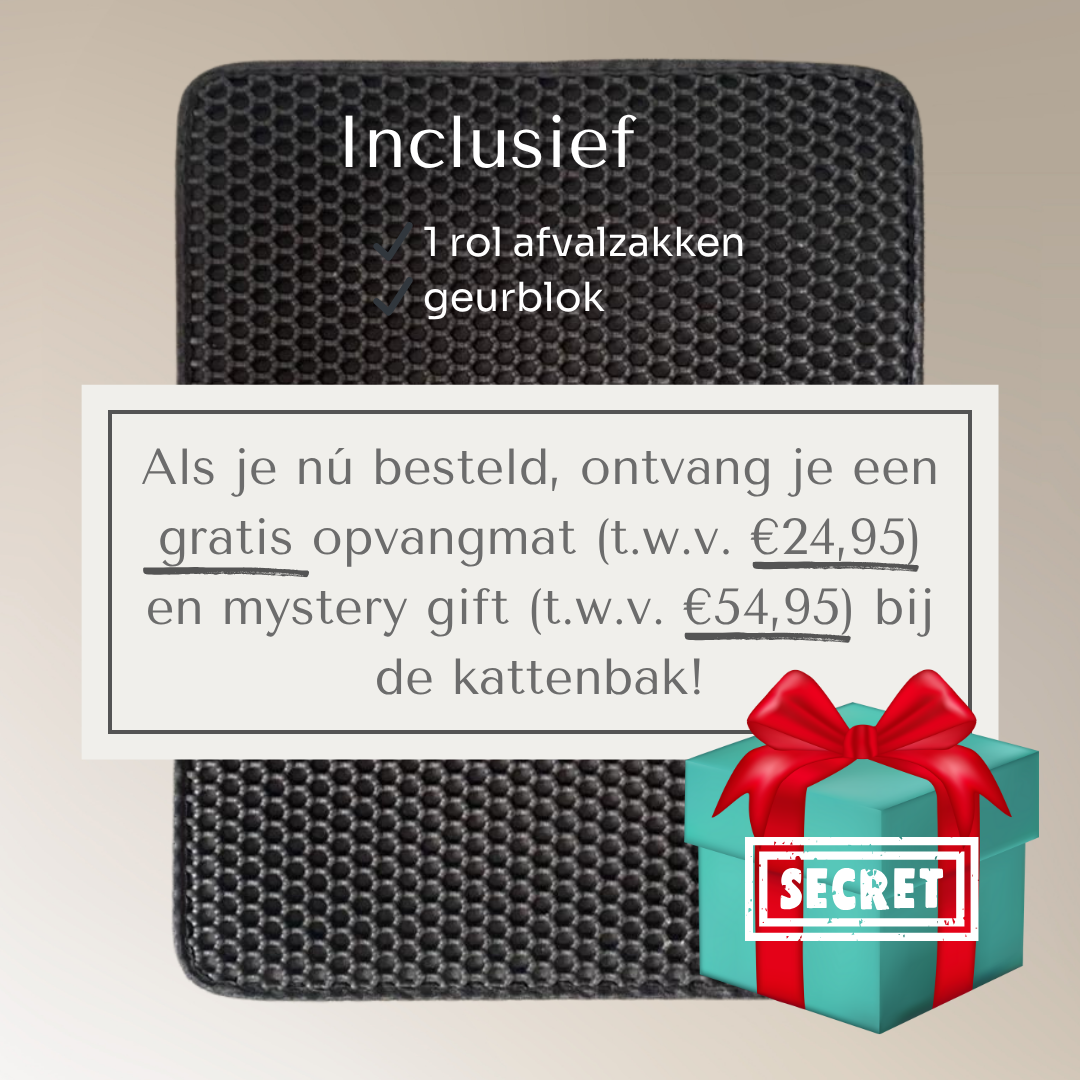 Als je nú besteld, ontvang je een gratis opvangmat (t.w.v. €24,95) en mystery gift (t.w.v. €54,95) bij de kattenbak!